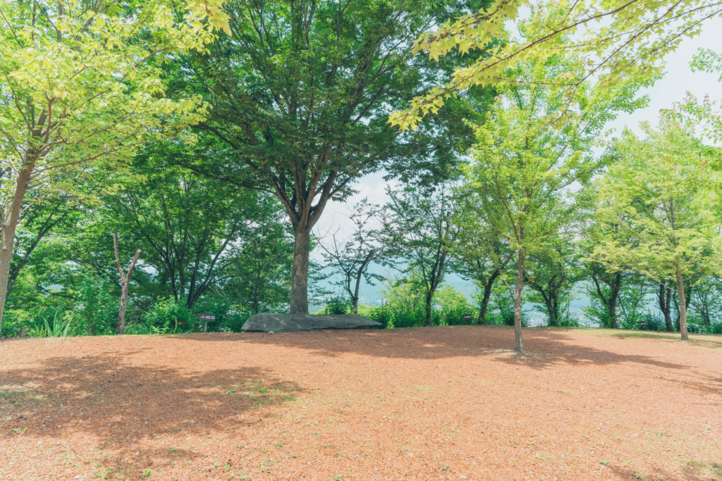 目の前の大きな木とその下の平たい石が特徴的な区画です。この石はテーブルにしたり、荷物置きにしたり、椅子にしたりと活用は様々♪